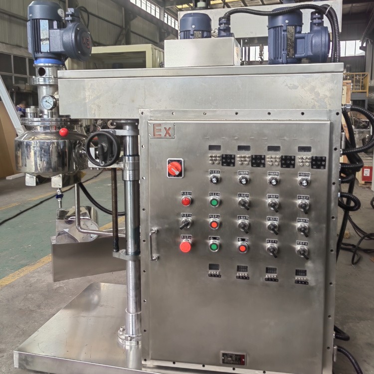 第三種是分散盤(pán)式溶解攪拌器,在均質(zhì)乳化機(jī)的攪拌軸底端裝有一圓盤(pán)狀的攪拌器--分散盤(pán)攪拌器,由電機(jī)直接帶動(dòng),轉(zhuǎn)速為1400rpm。它的旋轉(zhuǎn)方向與刮板攪拌器相反。分散盤(pán)在攪拌軸上可上下移動(dòng)調(diào)節(jié),以達(dá)到更佳的效果。這種攪拌器攪拌時(shí)相當(dāng)激烈,物料由中心向外翻騰,它的作用是迅速將新加入的組份潤(rùn)濕混合和分散溶解到液體或膏狀物料中,它是一種剪切力很大的攪拌器,適合高粘度物料。它與均質(zhì)乳化機(jī)的刮板攪拌器和膠體磨組合成另一形式的均質(zhì)攪拌系統(tǒng)。